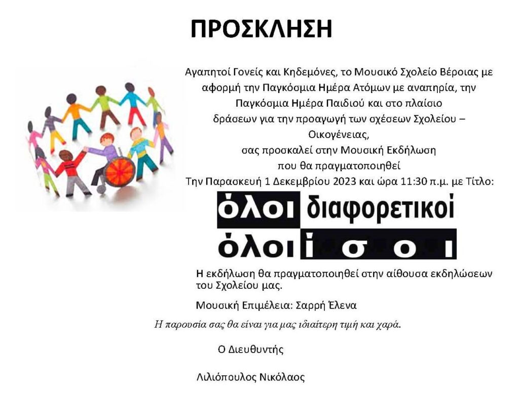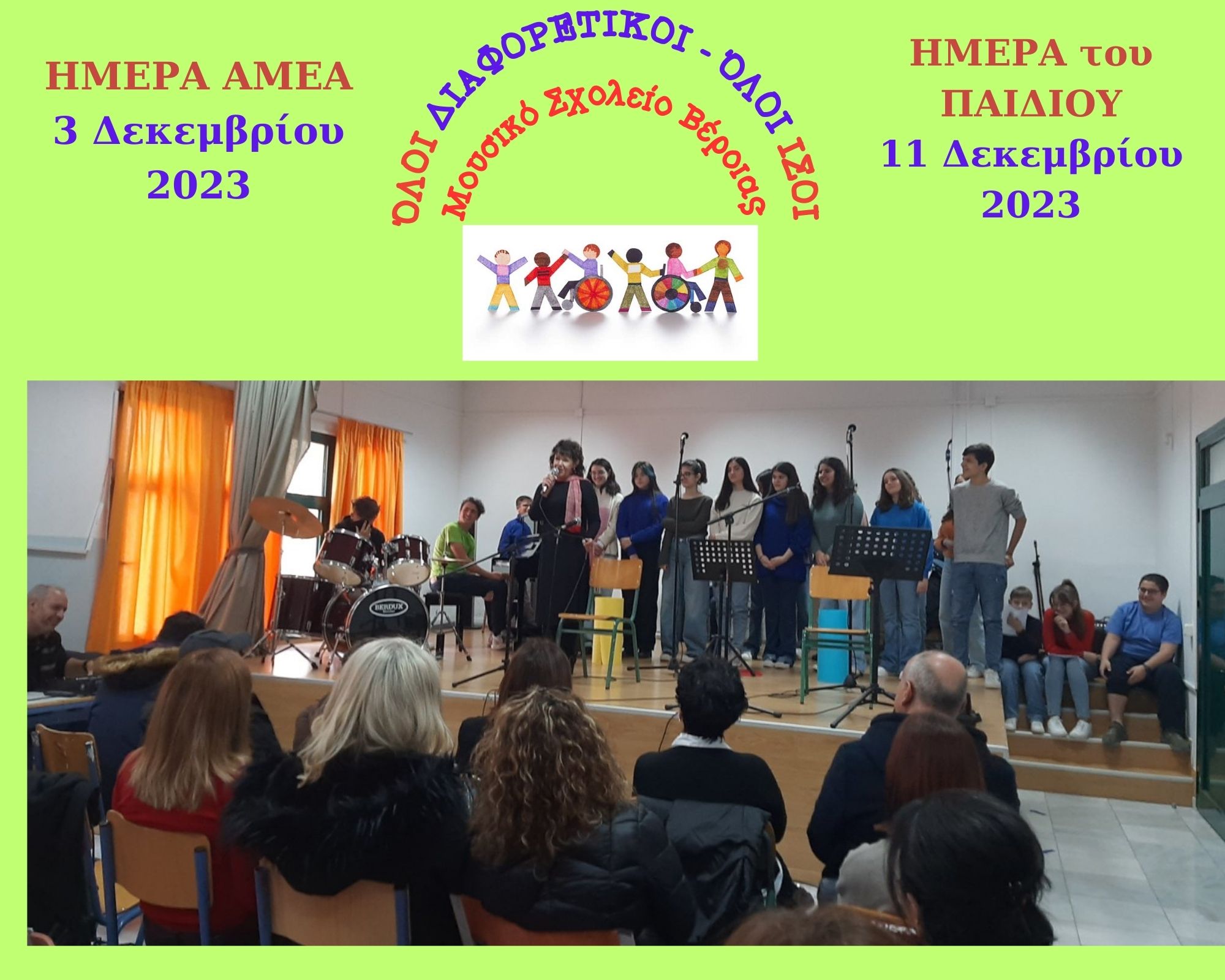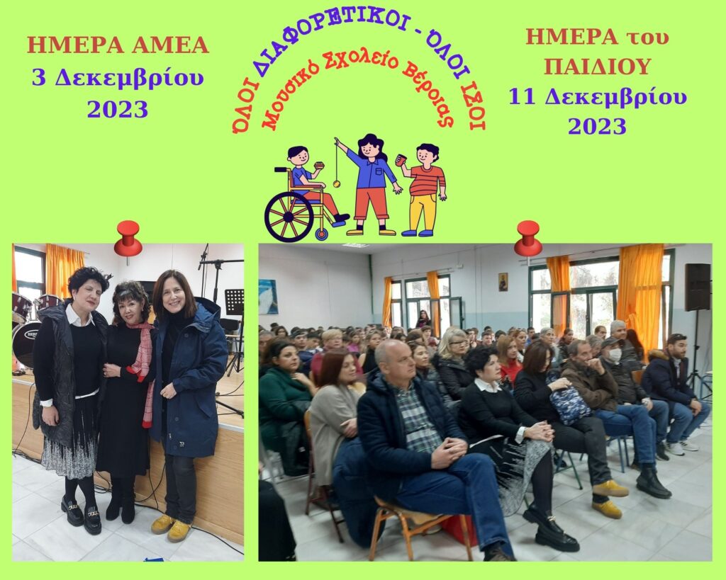 Μουσική εκδήλωση πραγματοποιήθηκε την Παρασκευή 1 Δεκεμβρίου 2023 με αφορμή την Παγκόσμια Ημέρα Ατόμων με Αναπηρία (3 Δεκεμβρίου) και την Παγκόσμια Ημέρα για τα δικαιώματα του Παιδιού (11 Δεκεμβρίου) από μαθητές των τμημάτων γ1, β2, α1 και α2 του γυμνασίου, καθώς και της Α΄ Λυκείου. Παρευρέθηκαν η Διευθύντρια του Ειδικού Δημοτικού Σχολείου Βέροιας κ. Χρύσα Μάνια, η εκπαιδευτικός ειδικής αγωγής κ. Χρύσα Καϊμάκη και αρκετοί γονείς των μαθητών του σχολείου.