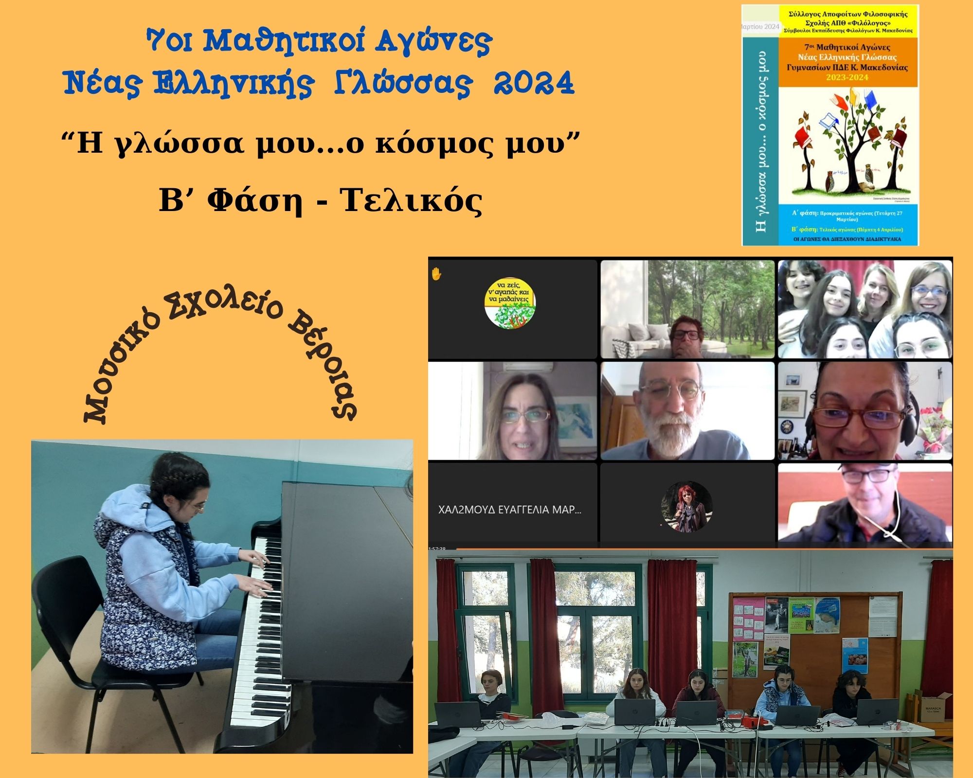 Στη Β΄ φάση των 7ων Μαθητικών Αγώνων Νέας Ελληνικής Γλώσσας που πραγματοποιήθηκαν διαδικτυακά την Πέμπτη 4 Απριλίου 2024 είχαν την ευκαιρία να συμμετάσχουν οι μαθητές/τριες που αποτελούσαν την πενταμελή ομάδα του Μουσικού Σχολείου Βέροιας με τις καθηγήτριές τους, Σκουμποπούλου Χαρά και Χονδραντώνη Εύη.