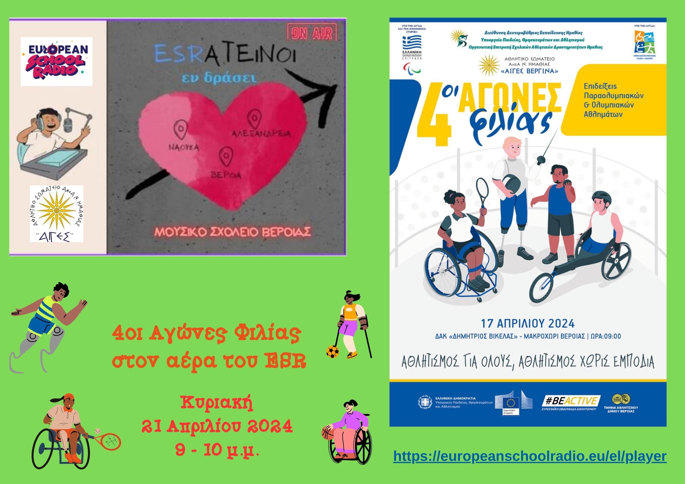 Οι “ESRατεινοί εν δράσει” που αποτελείται από μαθητές/τριες της α΄ και β΄ γυμνασίου συμμετείχε ενεργά σε ένα μοναδικό αθλητικό γεγονός της Ημαθίας, στους 4ους Αγώνες Φιλίας, που συνδιοργάνωσε το Αθλητικό Σωματείο ΑμεΑ “Αιγές Βεργίνα” με τη Διεύθυνση Δευτεροβάθμιας Εκπαίδευσης Ν. Ημαθίας στο ΔΑΚ “Βικέλας” του Μακροχωρίου του Δήμου Βέροιας την Τετάρτη 17 Απριλίου 2024 με τη στήριξη και τη συνεργασία του ευρωπαϊκού προγράμματος #BEACTIVE ως δράση του BeActiveHellas, του Υπουργείο Παιδείας, Θρησκευμάτων και Αθλητισμού και του τμήματος Αθλητισμού του Δήμου Βέροιας, υπό την αιγίδα της Ελληνική Παραολυμπιακή Επιτροπή – Hellenic Paralympic Committee και της ΕΘΝΙΚΗ ΑΘΛΗΤΙΚΗ ΟΜΟΣΠΟΝΔΙΑ ΑΤΟΜΩΝ ΜΕ ΑΝΑΠΗΡΙΕΣ!