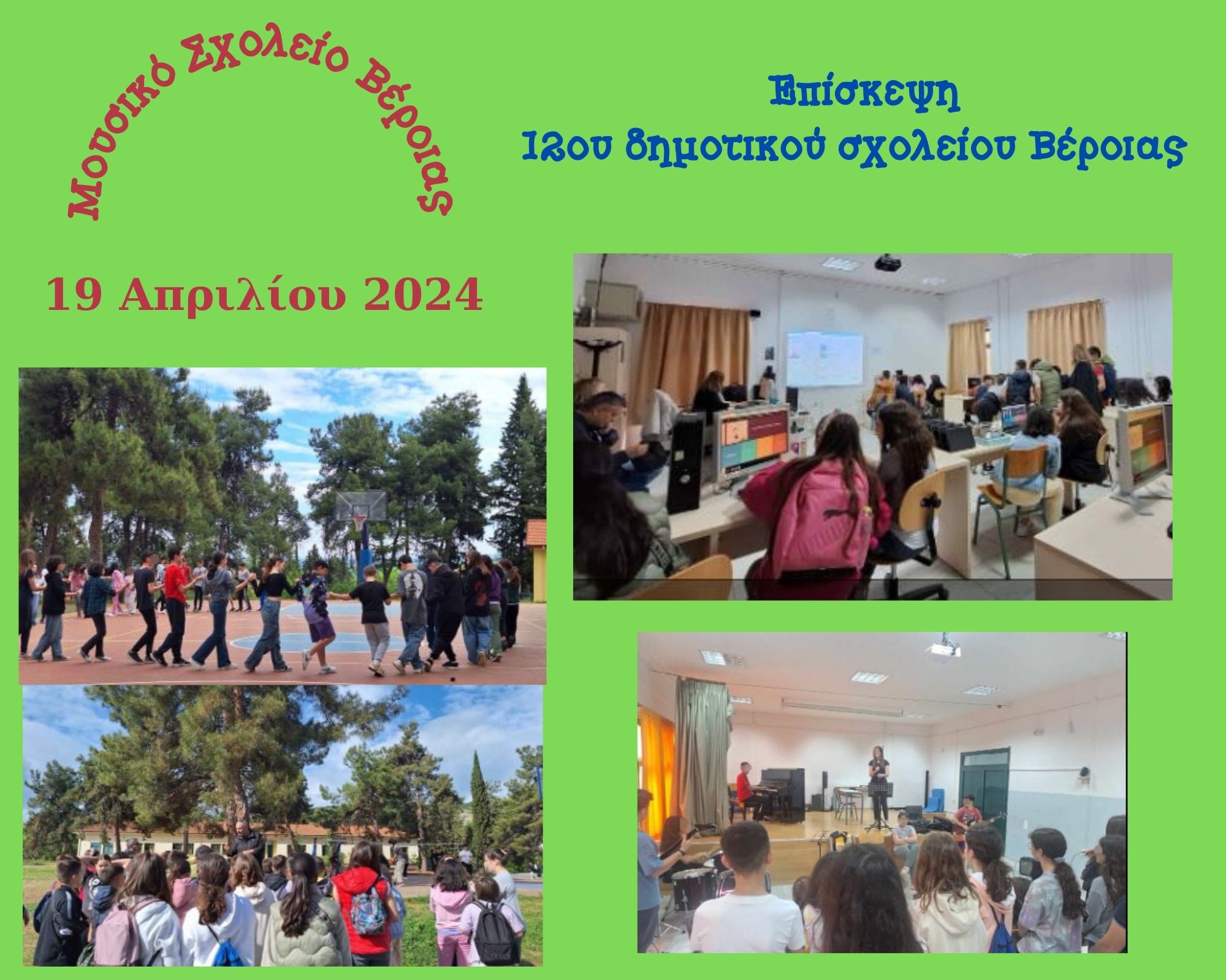 Εκ μέρους του Μουσικού Σχολείου Βέροιας, θα θέλαμε να ευχαριστήσουμε θερμά τους μαθητές/τριες και τους εκπαιδευτικούς του 12ου Δημοτικού Σχολείου Βέροιας για την επίσκεψή τους στο σχολείο μας. Χαιρόμαστε που το Μουσικό Σχολείο Βέροιας μπόρεσε να προσφέρει στους μαθητές/τριες του 12ου Δημοτικού Σχολείου Βέροιας μια αξέχαστη εμπειρία και να τους δώσει μια γεύση από την μουσική ατμόσφαιρα και το φιλόξενο περιβάλλον του σχολείου μας. Η επίσκεψη αυτή ήταν μια πολύτιμη εμπειρία και για εμάς, καθώς μας έδωσε την ευκαιρία να μοιραστούμε την αγάπη μας για τη μουσική και να παρουσιάσουμε στους μαθητές/τριες τις δυνατότητες και τα ιδιαίτερα χαρακτηριστικά του Μουσικού Σχολείου Βέροιας.