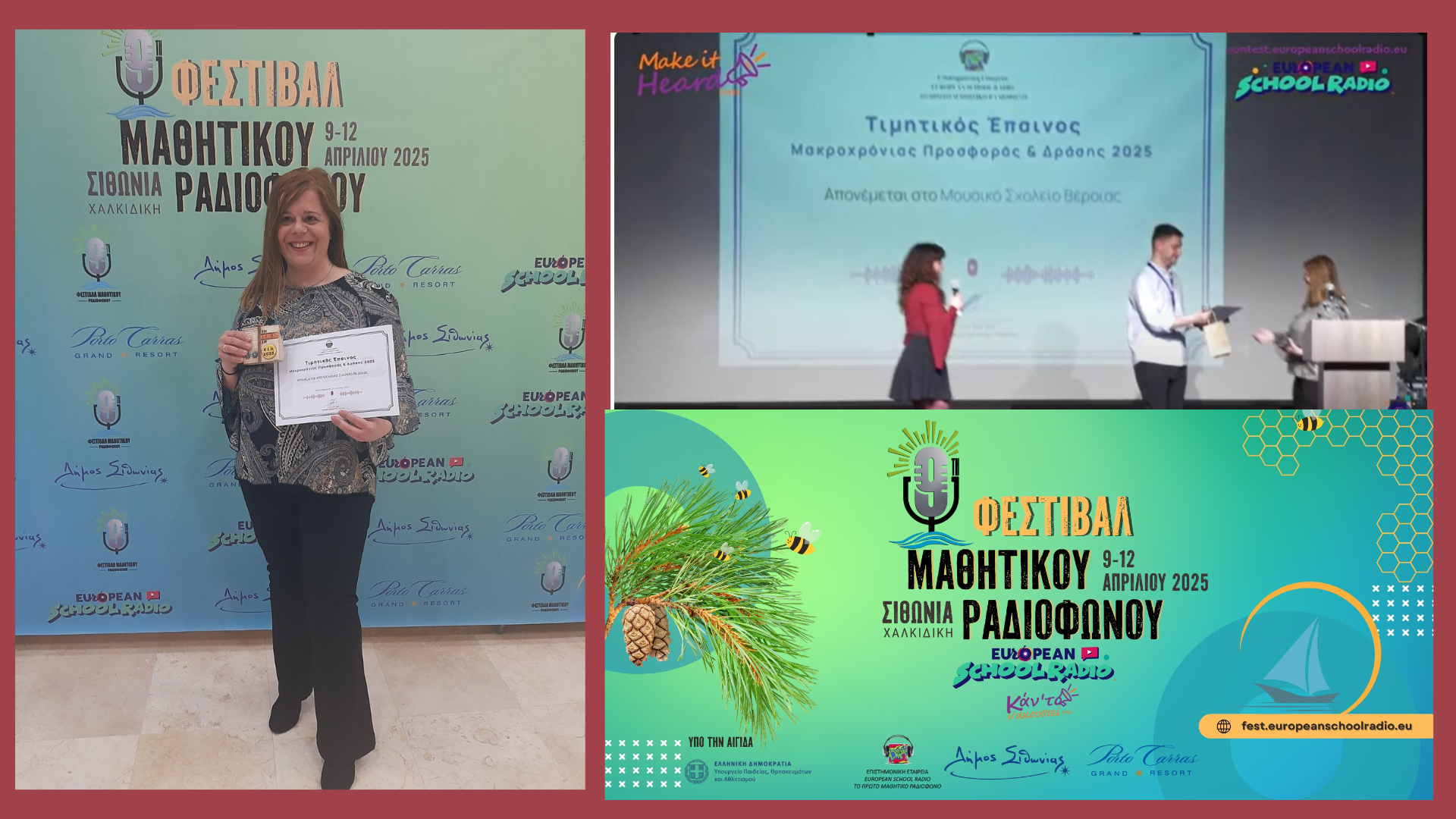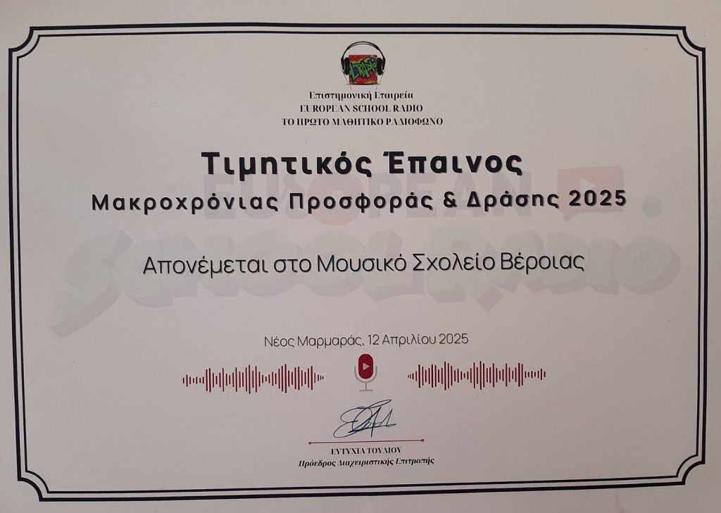 Ευχαριστούμε θερμά το ραδιόφωνο της καρδιάς μας – European School Radio για την απονομή Τιμητικού Επαίνου Mακροχρόνιας Προσφοράς και Δράσης στο Μουσικό Σχολείο Βέροιας στο πλαίσιο της Τελετής Βράβευσης Podcasts “Καν΄ το ν’ ακουστεί 2025” που πραγματοποιήθηκε στο Πόρτο Καρράς στον Νέο Μαρμαρά Χαλκιδικής.