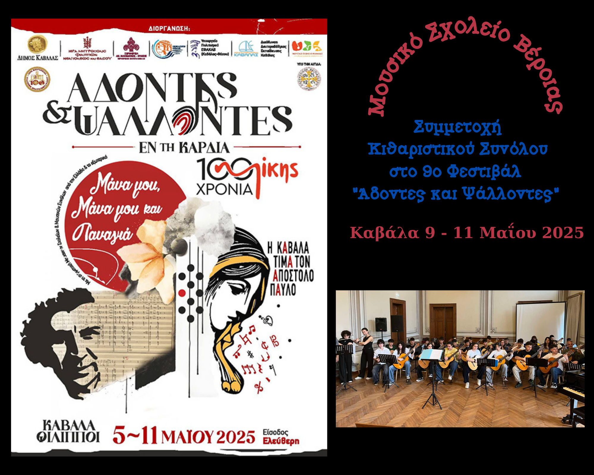 Με μεγάλη επιτυχία πραγματοποιήθηκε η συμμετοχή του Κιθαριστικού Συνόλου του Μουσικού Σχολείου Βέροιας στην πόλη της Καβάλας, στην φετινή 9η κατά σειρά διοργάνωση εκδηλώσεων του Φεστιβάλ Άδοντες και Ψάλλοντες εν τη καρδία που διοργάνωσε το Μουσικό Σχολείο Καβάλας. Το Φεστιβάλ φέτος είχε τον τίτλο: “Μάνα μου μάνα μου και Παναγιά – 100 χρόνια Μίκης” καθώς ήταν αφιερωμένο στο πρόσωπο της μάνας, με αφορμή την παγκόσμια ημέρα της αλλά και στον Μίκη Θεοδωράκη με αφορμή τον εορτασμό των 100 χρόνων από τη γέννηση του μεγάλου συνθέτη.