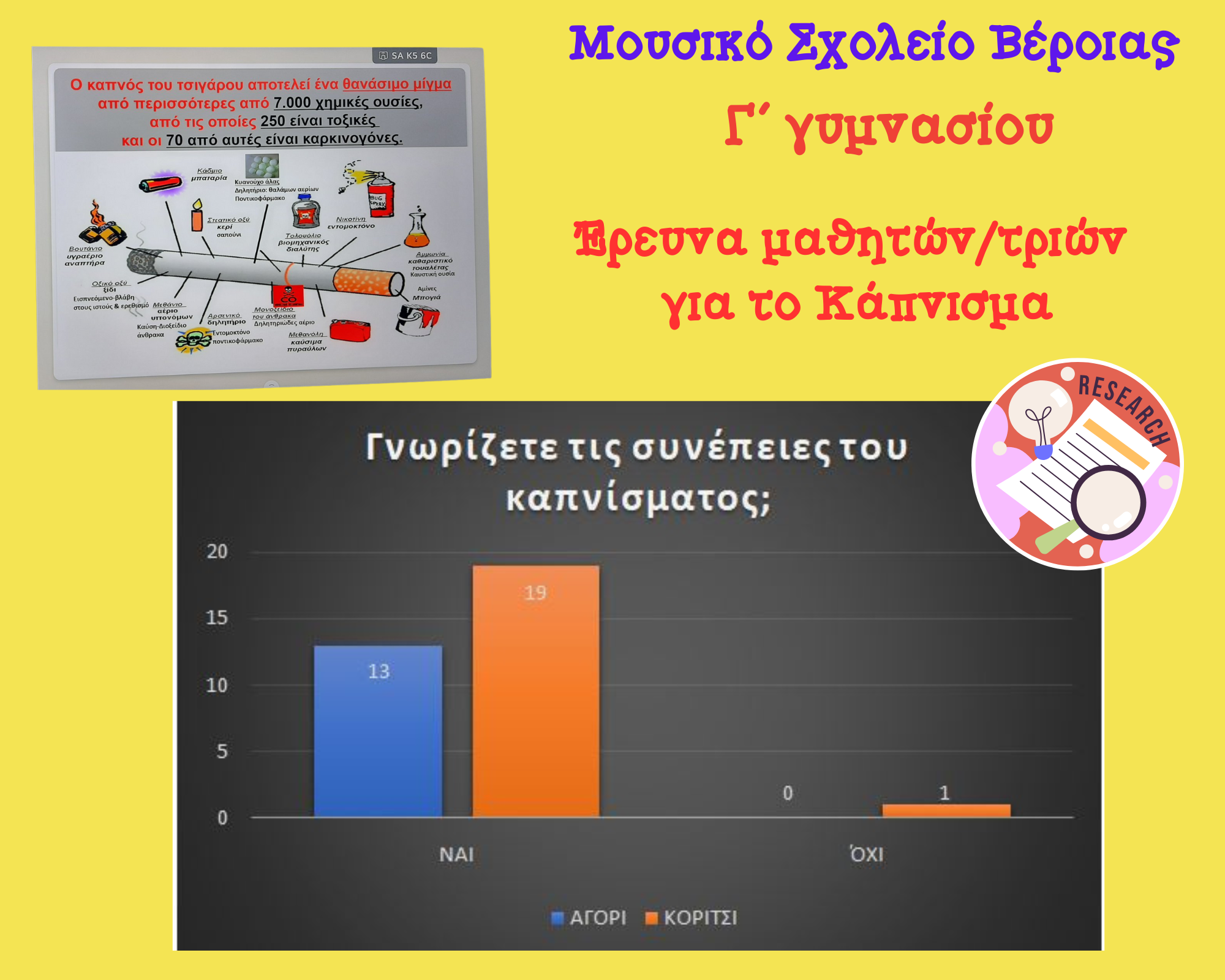 Στο μάθημα της Βιολογίας, και με την καθοδήγηση της καθηγήτριας, Αγλαΐας Ντάκα, οι μαθητές/τριες δημιούργησαν ένα ερωτηματολόγιο. Στόχος τους ήταν να διερευνήσουν τις απόψεις και τις γνώσεις των συμμαθητών/τριών τους γύρω από το κάπνισμα και τις συνέπειές του.
