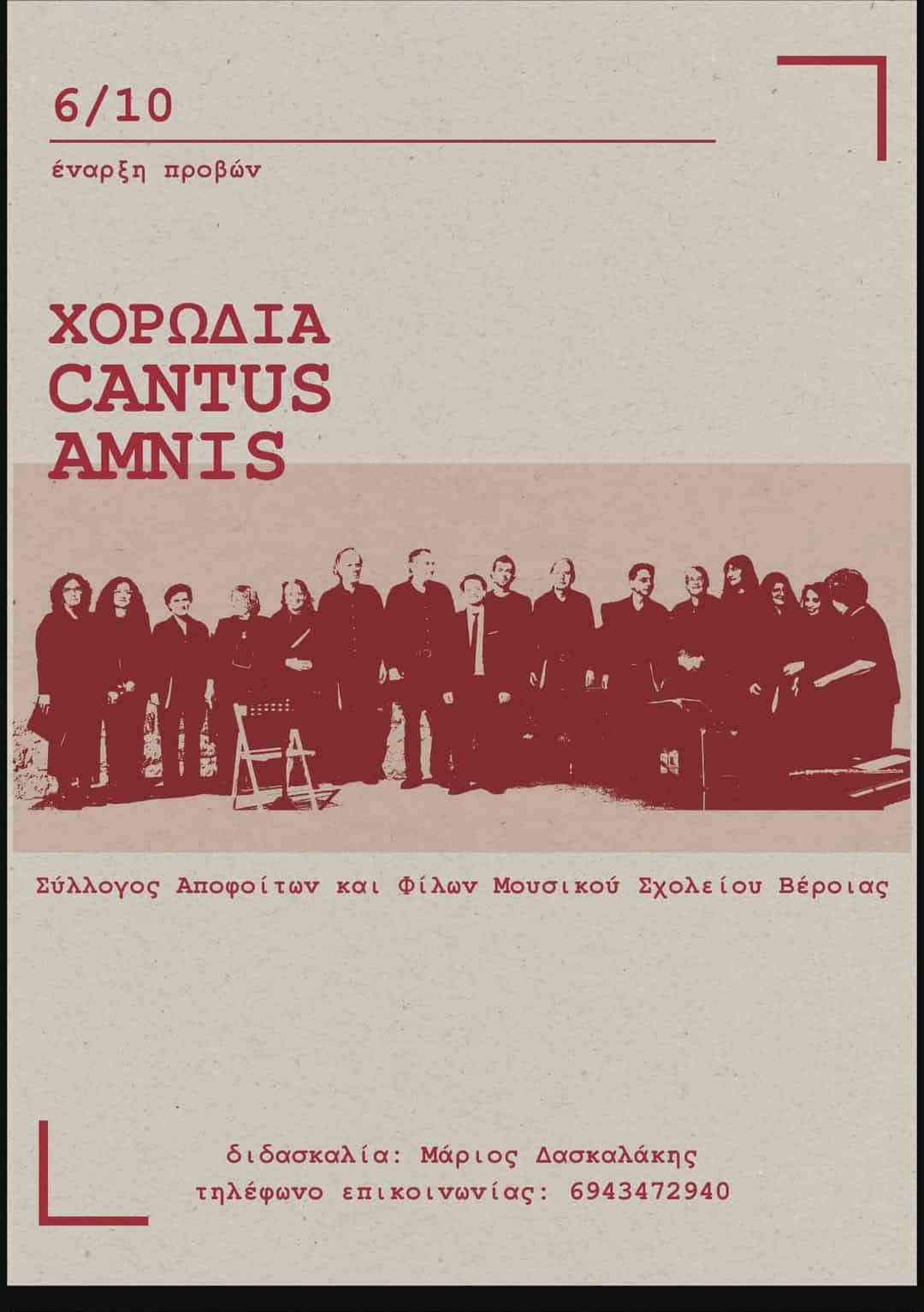 Ο Σύλλογος Φίλων κι Αποφοίτων του Μουσικού Σχολείου Βέροιας ανακοινώνει την έναρξη των προβών της Χορωδίας CANTUS AMNIS για την καλλιτεχνική περίοδο 2025-2026.