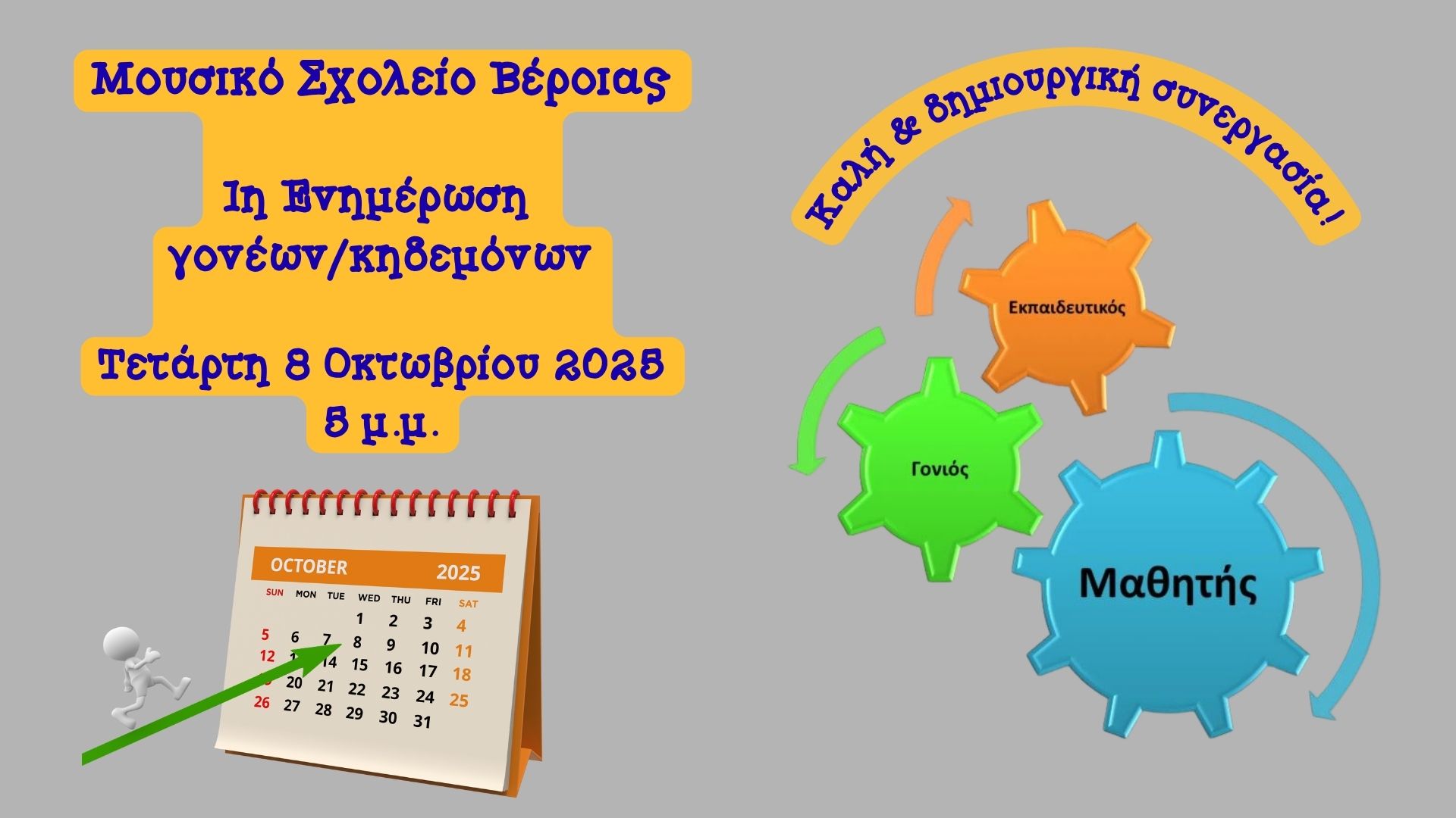 Με μεγάλη συμμετοχή και επιτυχία πραγματοποιήθηκε την Τετάρτη 8 Οκτωβρίου 2025 η καθιερωμένη Πρώτη Ενημερωτική Συνάντηση με τους Γονείς και Κηδεμόνες των μαθητών/τριών της Α’ Γυμνασίου του Μουσικού Σχολείου Βέροιας, σηματοδοτώντας επίσημα την έναρξη του σχολικού έτους 2025-2026.