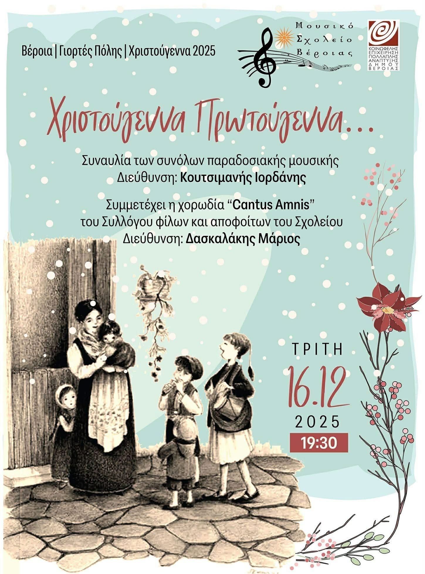 Την Τρίτη 16 Δεκεμβρίου 2025 στον Χώρο Τεχνών “Θάνος Μικρούτσικος” θα πραγματοποιηθεί η συναυλία των συνόλων παραδοσιακής μουσικής του Μουσικού Σχολείου Βέροιας, με κάλαντα και τραγούδια από όλη την Ελλάδα. Συμμετέχει ιαι η Χορωδία Cantus Amnis του συλλόγου Φίλων και Αποφοίτων του σχολείου μας! Σας περιμένουμε!
