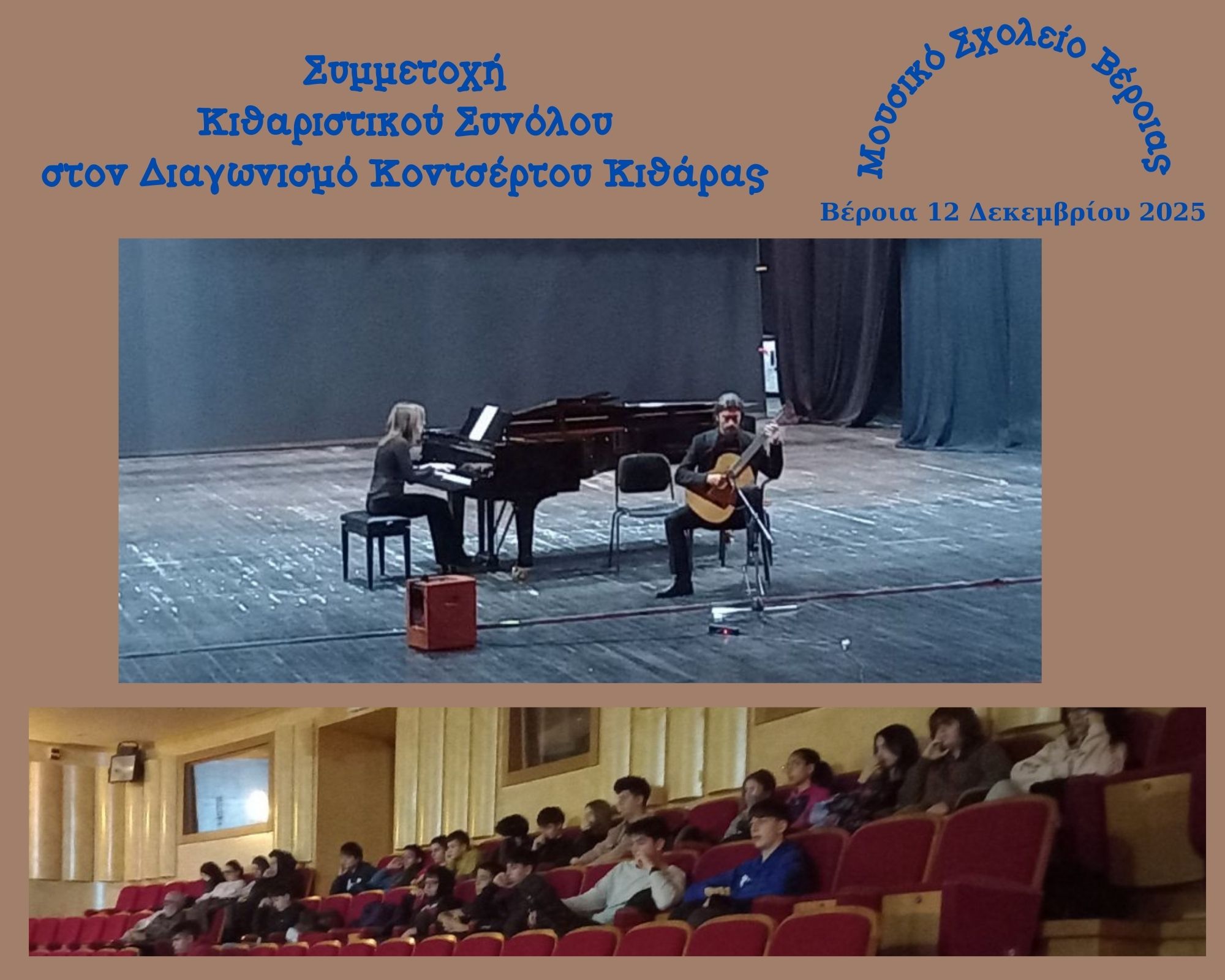 .Το πρωί της Παρασκευής 12 Δεκεμβρίου 2025 το Κιθαριστικό Σύνολο του Μουσικού Σχολείου Βέροιας παρακολούθησε τον Διαγωνισμό Κοντσέρτου Κιθάρας (Προκριματικός κύκλος) στον Χώρο Τεχνών “Θάνος Μικρούτσικος”.