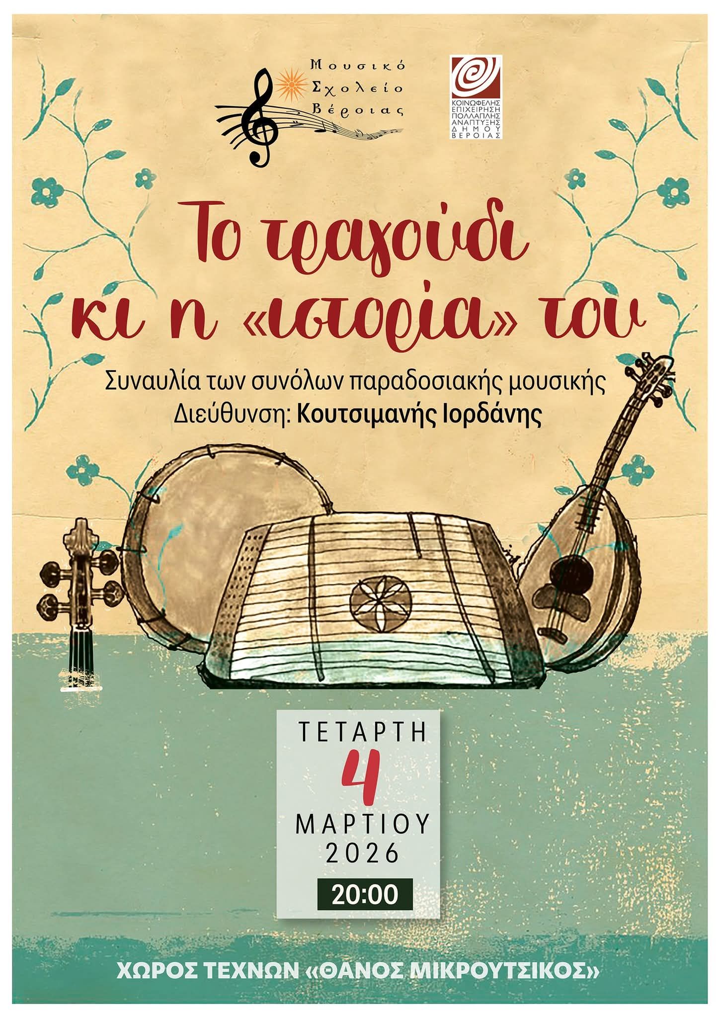 Συναυλία των Συνόλων Παραδοσιακής Μουσικής, με τίτλο «Το τραγούδι κι η ιστορία του», παρουσιάζει το Μουσικό Σχολείο Βέροιας, την Τετάρτη 4 Μαρτίου 2026, στις 8:00μ.μ. στον Χώρο Τεχνών – Θάνος Μικρούτσικος, σε συνεργασία με την ΚΕΠΑ Δήμου Βέροιας.