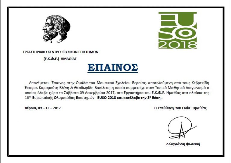 Την τρίτη θέση μεταξύ 6 ομάδων διαφόρων Λυκείων του Νομού Ημαθίας κατέλαβε η ομάδα του Μουσικού Σχολείου Βέροιας στο Διαγωνισμό για την 16η Ευρωπαϊκή Ολυμπιάδα Φυσικών Επιστημών (16th European Union Science Olympiad – EUSO 2018). Το Μουσικό Σχολείο…